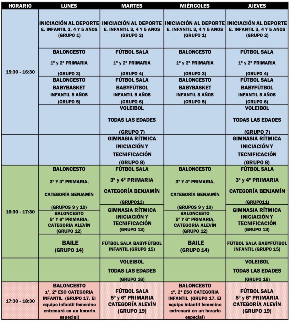 Todos los grupos realizarán dos sesiones semanales de entrenamiento (los equipos federado podrían realizar una sesión extra). En el caso de equipos que compiten,  añadirán partidos oficiales los sábados por la mañana.
